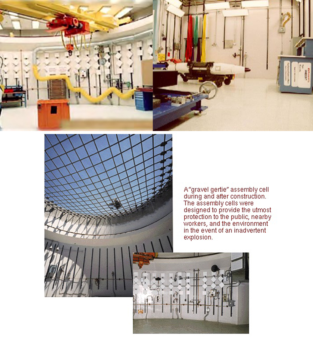 The assembly cells were named Gravel Gerties after a 1950s comic-strip character. Modeled after the structure at Pantex Plant, these are where hands-on assembly and disassembly of U.S. nuclear weapons and devices would take place. They provide the maximum environmental and personnel protection in the event of an inadvertent high-explosive detonation.