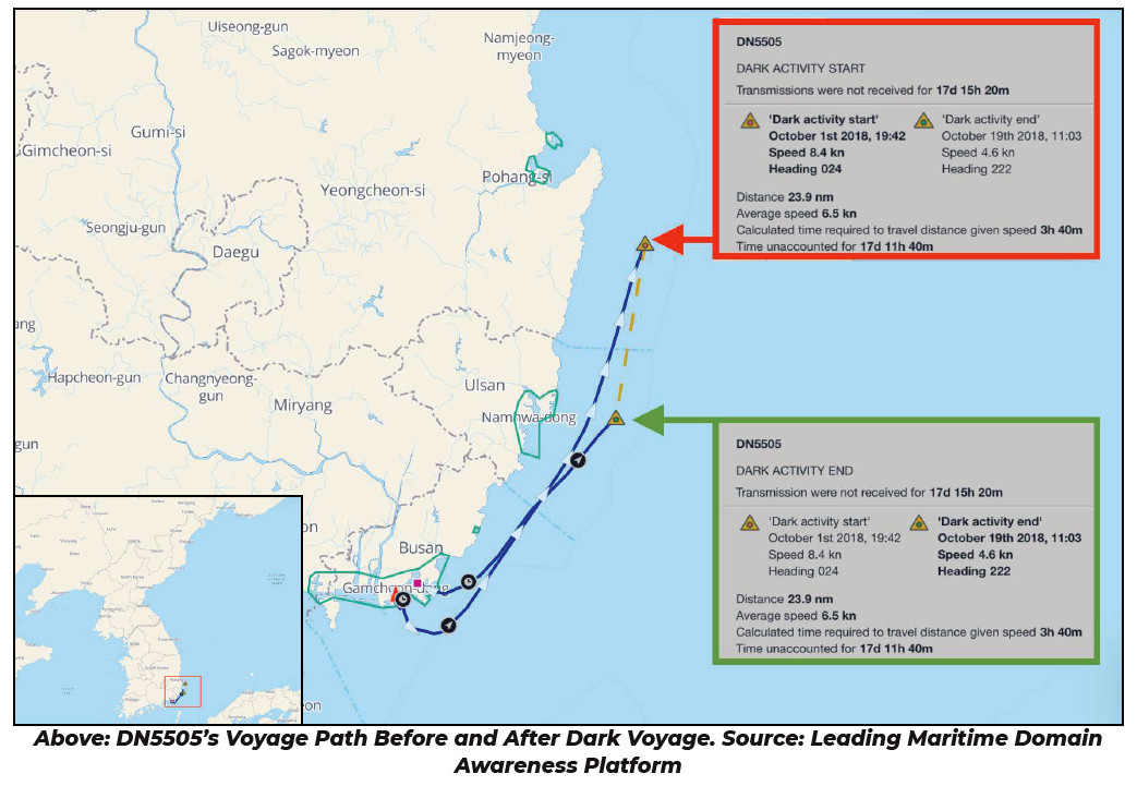 When the ship’s transponder began broadcasting again, it was heading back to Busan. C4ADS found no reports that the vessel had arrived in Nakhodka, or any of five other Russian Far East ports, on or about Oct. 5. However, after arriving in Pohang, South Korea, the ship’s crew informed South Korean customs officials that it had picked up a cargo of coal in Nakhodka.