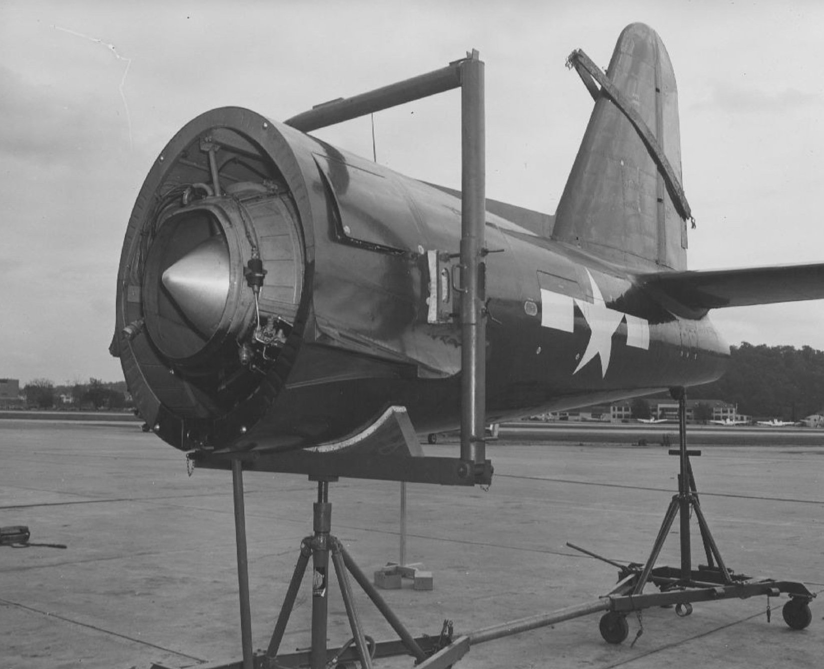 As the Navy’s first operational mixed-power carrier aircraft, the FR-1’s powerplant was intended to be fairly straightforward for the pilot to operate. The piston and jet engines used the same fuel and the engine controls allowed the pilot to switch back and forth between piston and jet, using two throttles located side-by-side on the same console. One drawback of having two distinct powerplants was the fact that the air intakes for the jet were in the wing leading edges, reducing the fixed armament to just four Browning 50-caliber machine guns in the center panels of the wings.