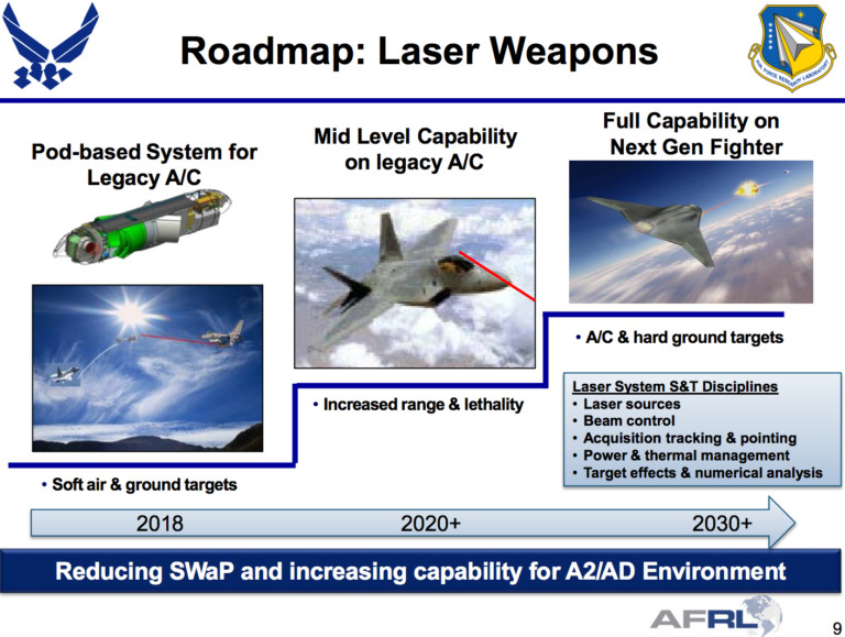 Now, as far as… I don’t know, if you call them 5th gen [fighters], but as far as 5th gen is concerned, as you can well imagine… you’re probably not going to hang a pod off of that plane, and so, the ability for the system to be packaged up inside is gonna become key. And once again, there isn’t a lot of room… So, continuing to reduce the volume [taken-up by a laser weapon]. Most importantly, these planes can actually lift a lot of weight. They have more ability to lift weight than there is actual room to put things inside… But as a prime platform maker, we understand what the options are and where things could potentially go.