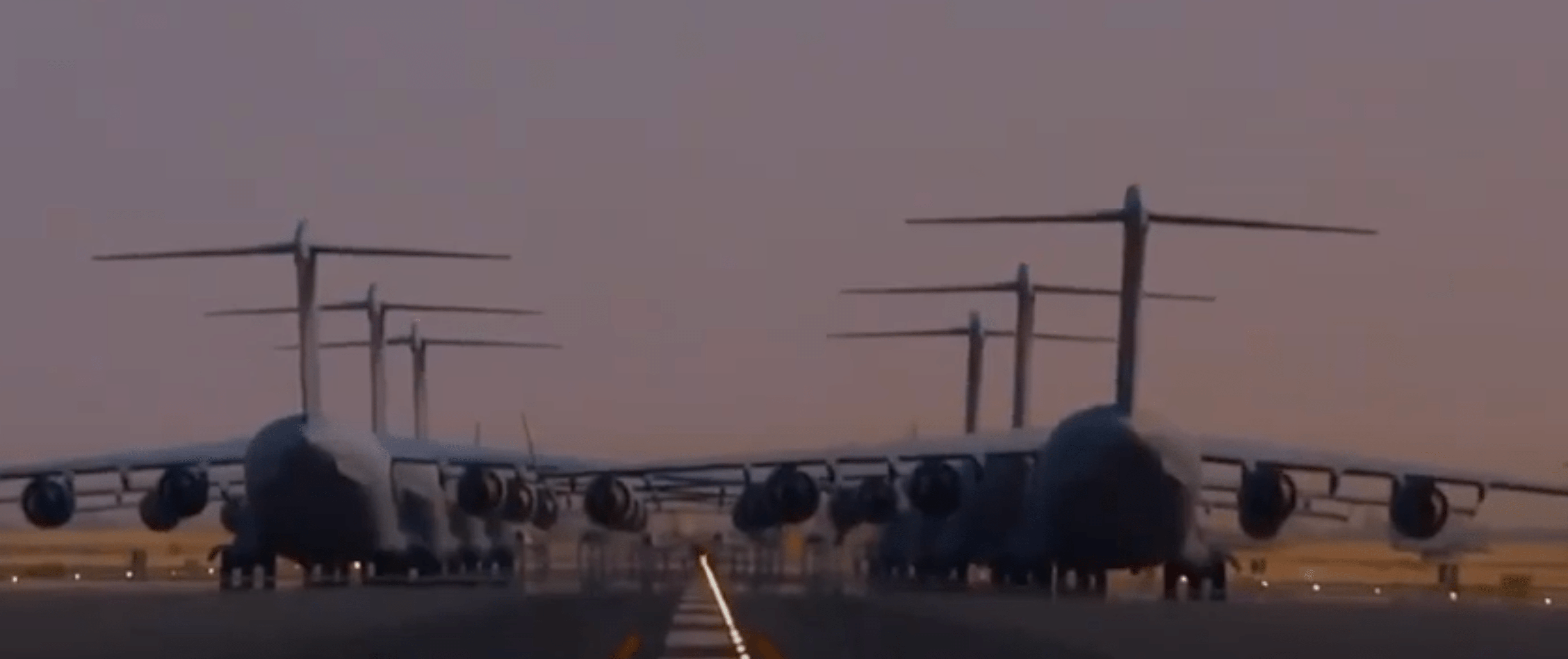 After we see Rafales and C-17s taxiing on parallel runways, the perspective of the video switches to a view down the runway, revealing a spectacular line-up of at least 18, and possibly more, Rafales, followed by the C-17s. Further along the runway, ahead of the Rafales, are three AW139s and four AH-64s, which would have departed before the fixed-wing types.