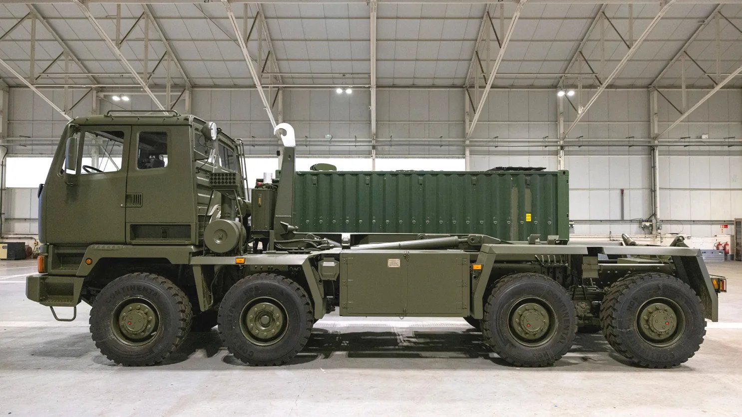 The entire Gravehawk system fits inside a modified ISO shipping container with a retractable roof, and it’s intended to be emplaced on the ground before use, although it’s unclear if it can be employed while it is still on the back of the truck that transports it. The truck apparently associated with Gravehawk is an eight-wheeled Leyland DAF design equipped with the Demountable Rack Offload and Pickup System (DROPS), which is capable of relatively quickly loading and unloading containers.
