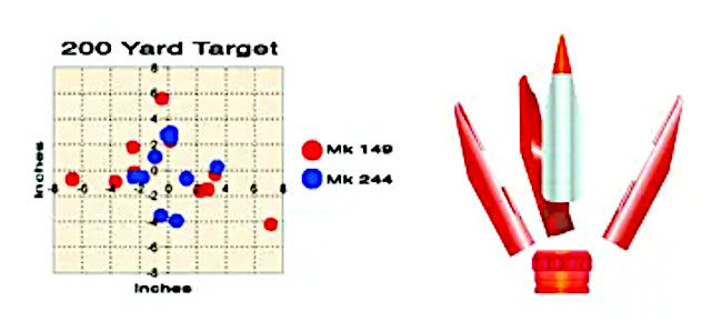 The Mk 244, produced by General Dynamics Ordnance and Tactical Systems (GD-OTS), is a kinetic round, meaning that it is designed to destroy targets by physically smashing into them. The round contains a subcaliber tungsten projectile inside a discarding plastic sabot.