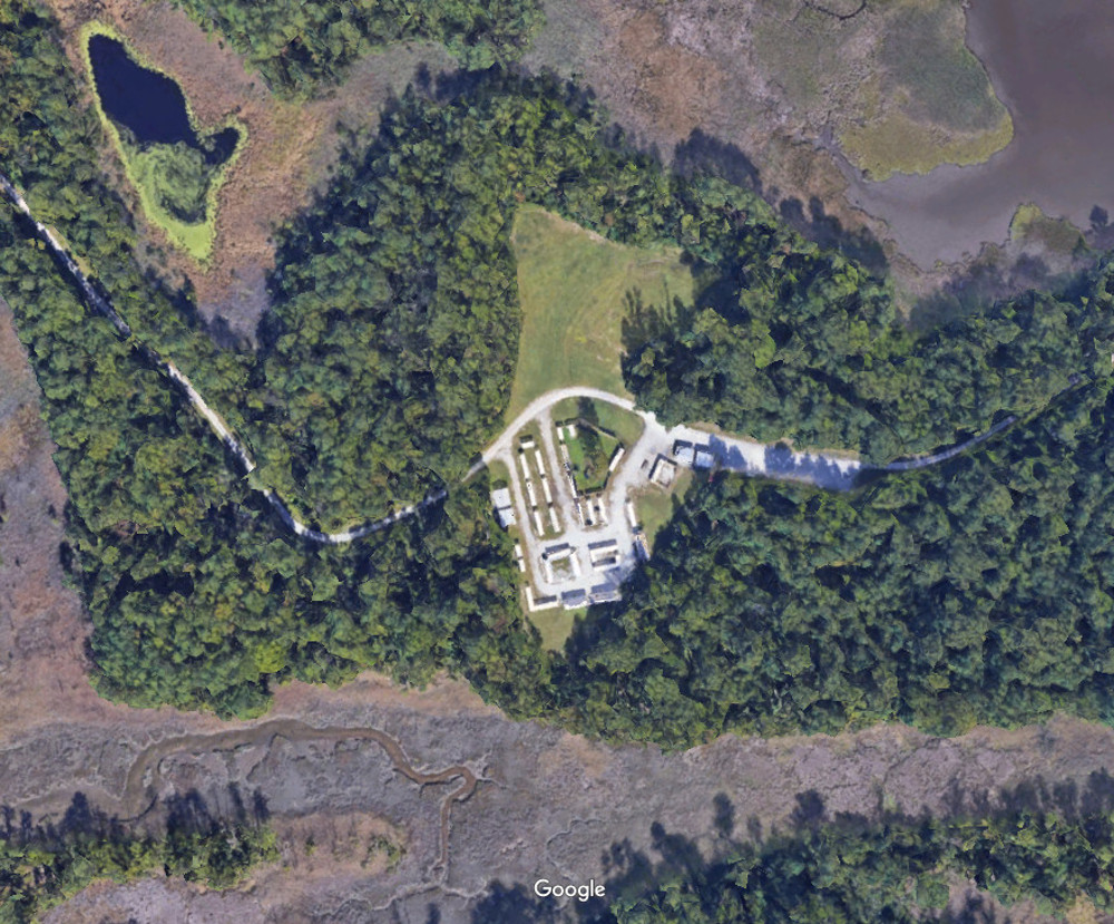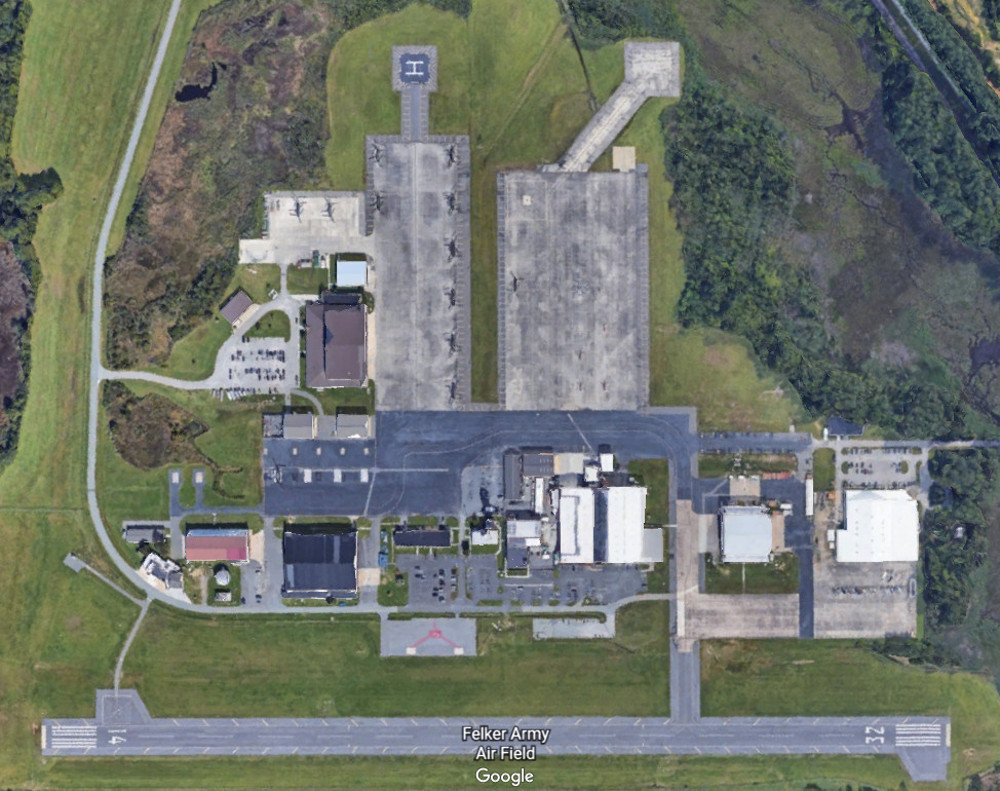 On top of that, Fort Eustis’ Felker Army Airfield, to which the existing hangar is adjacent, is basically in the middle of a swamp. Visible on Google Earth less than a mile southeast of the runway, deeper into unimproved marsh, is a collection of buildings or containers that match the basic description of the urban training area.