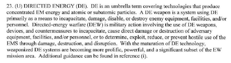 Electronic attack “may be used to deny an adversary freedom of action in space by preventing the [command and control] of space assets or by preventing or negating the ability to use space systems and services for purposes hostile to the U.S.,” one section of the regulation explains. “Cyberspace operations may be used to force an adversary from wired to wireless networks that are vulnerable” to electronic attack, another passage notes. The basic definition of directed energy warfare is “military action involving the use of [directed energy] weapons, devices, and countermeasures to incapacitate, cause direct damage or destruction of adversary equipment, facilities, and/or personnel or to determine, exploit, reduce, or prevent hostile use of the [electromagnetic spectrum] through damage, destruction, and disruption,” according to the guide.