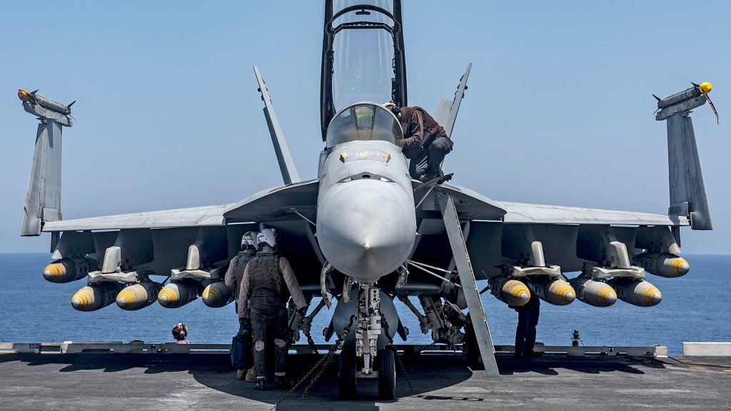 This F/A-18F Super Hornet, belonging to VFA-213 “Blacklions” and operating aboard the USS George H.W. Bush in the eastern Mediterranean, is equipped with one uniquely massive and highly destructive payload.