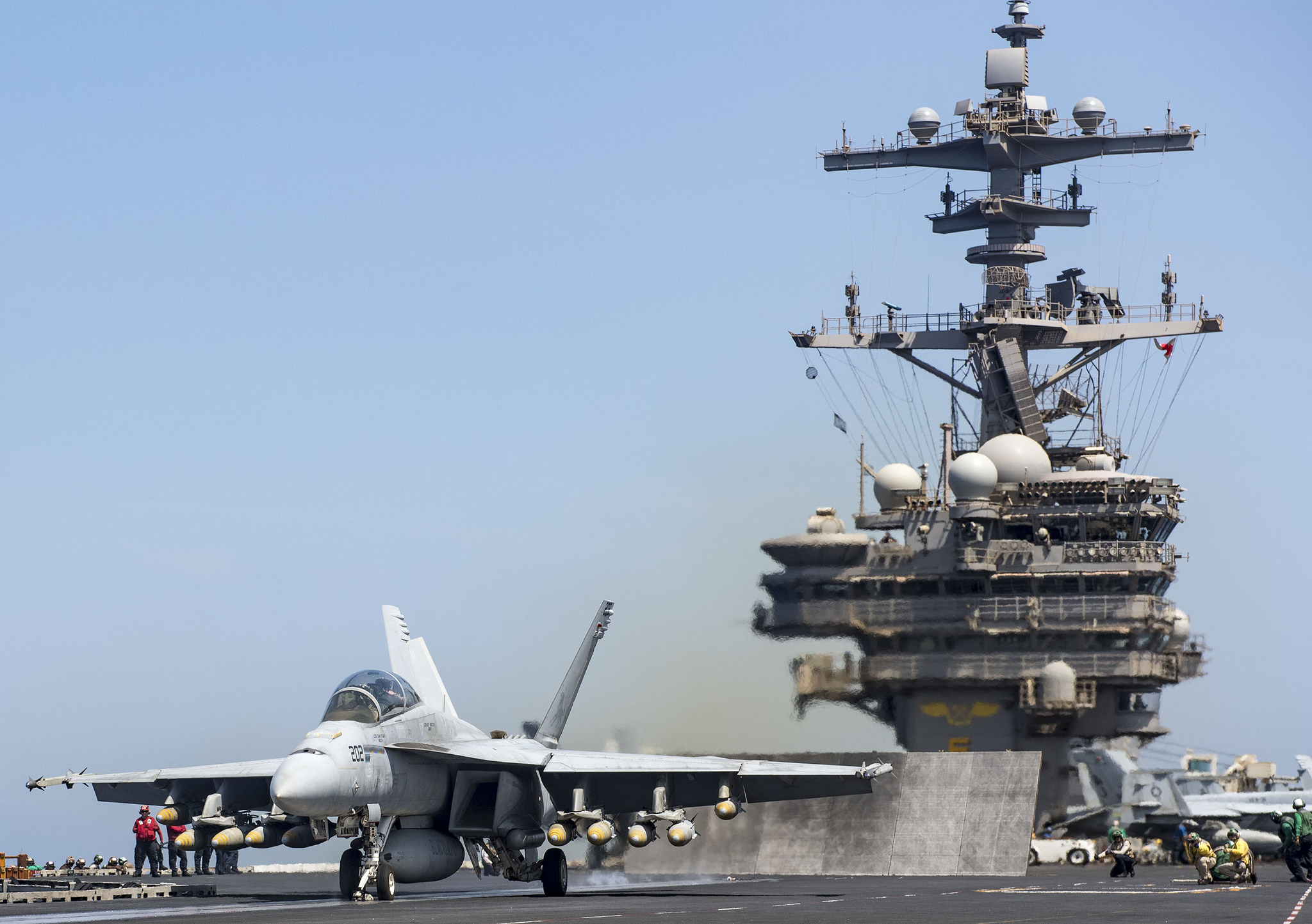 Such a heavy load is very unusual for the types of missions the F/A-18E/F has flown over Afghanistan, Iraq and now Syria since its combat debut in 2003. It is similar in weight to the type’s “Five Wet” tanker configuration, which puts the aircraft very near its max gross takeoff weight. In either configuration, the strike fighter will fly far more sluggishly, with a much narrower operating envelope than when in more common combat configurations.