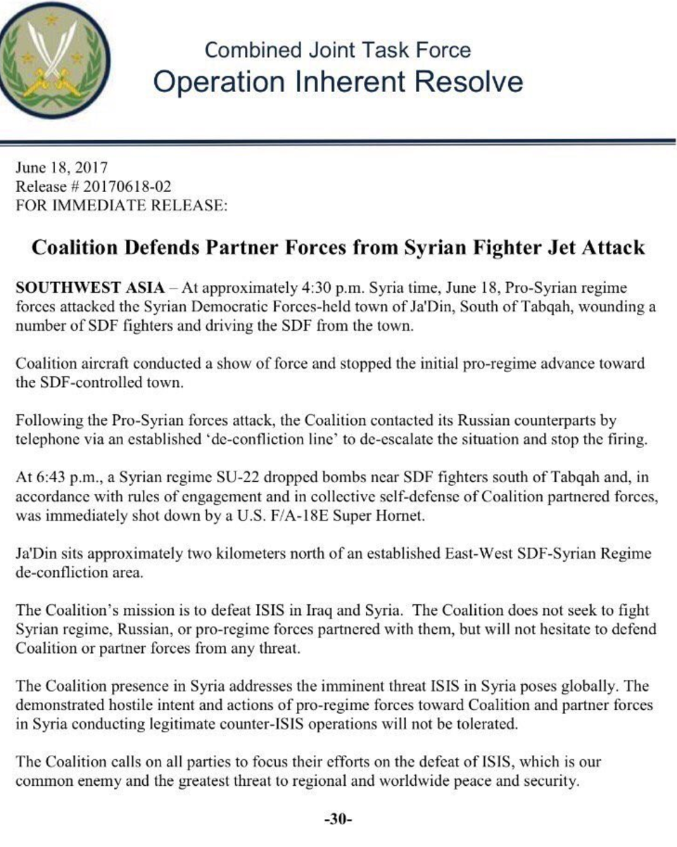 As it has become all too customary, the US-led coalition used its “deconfliction” hotline with Russia in an attempt to stop the assault on the area altogether. Then, just over two hours after the ground assault began, a Syria Air Force Su-22 attack aircraft showed up over the area and began dropping bombs of SDF forces located South of Al Tabqa. A USN Super Hornet shot the swing-wing jet out of the sky “in accordance with the rules of engagement and in collective self defense of coalition partnered forces.”