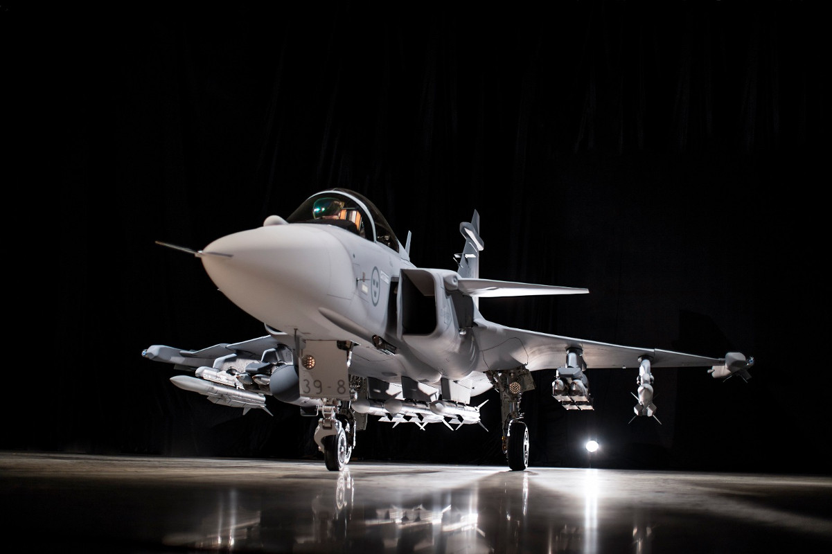 In particular, its Italian-built ES-05 Raven radar is a fast-scanning active, electronically-scanned array (AESA) unit that can track multiple targets at once. Installed on a moving mount, pilots can also focus the beam independent of the aircraft’s flight path, letting them maneuver without necessarily losing their radar picture. In order to make the jets more attractive to potential buyers, Saab says the plane’s physical and software architecture are inherently flexible, allowing countries to install their own gear, which could include indigenous systems such as the Link ZA.