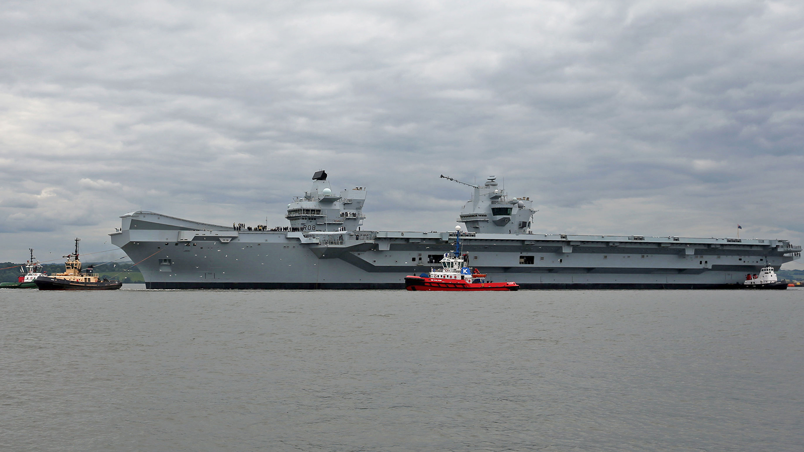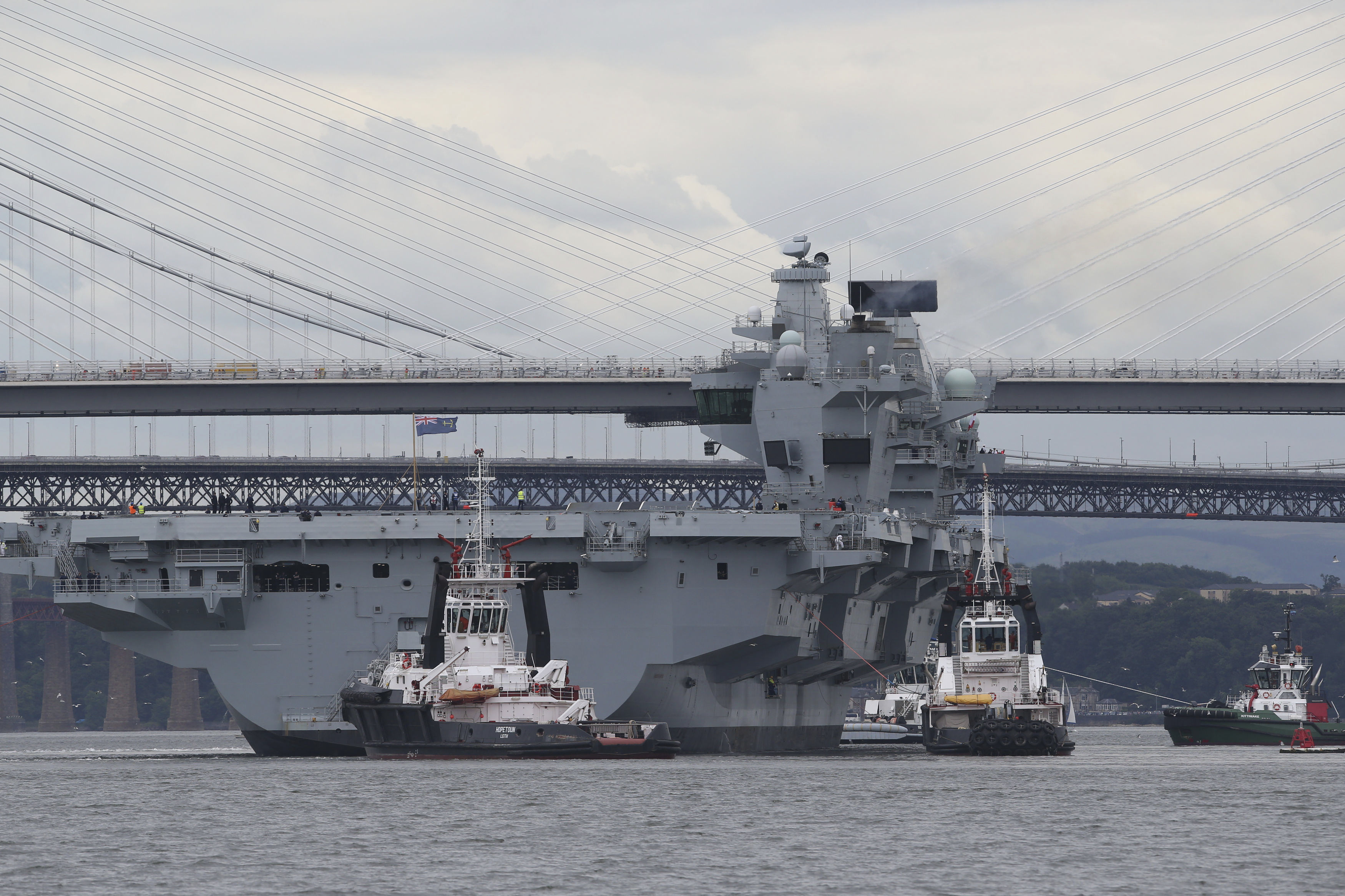 Given the sheer size of the ship the Royal Navy and shipbuilding consortium Aircraft Carrier Alliance (ACA) – a public-private partnership that includes the U.K. Ministry of Defense, BAE Systems, Babock International, and Thales UK – have already had to spend considerable time planning just how to get Queen Elizabeth out of port. They even made a more than two minute long animated video to show the process of moving the ship from Rosyth into the Firth of Forth and finally out onto the open seas. A small armada of nearly a dozen tugs got her out of the dockyard, where she had less than 150 feet of clearance with the seabed and at times came within less than 120 feet of the shore. Afterwards, she needed to wait for the tide to go down in order to squeak under four fixed bridges before finally making it out onto the North Sea.