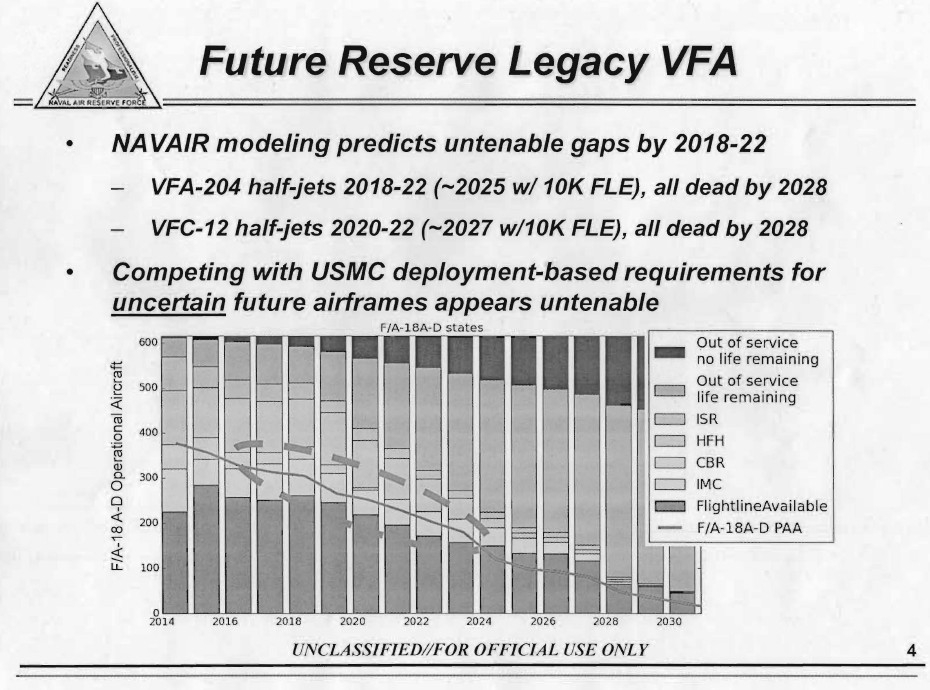 Of course, this isn’t a new issue, as both squadrons have been flying these jets for years now. A 2014 Naval Air Reserve Force briefing, which the author also obtained through FOIA, made it clear that without any plans to recapitalize the A+ model hornets, the squadrons would be at half strength by 2022 at the latest and their jets would be “all dead by 2028.” So, if the National Defense Authorization Bill passes into law with this language intact, it seems likely that the Navy would present at least three options to Congress to redress this issue.
