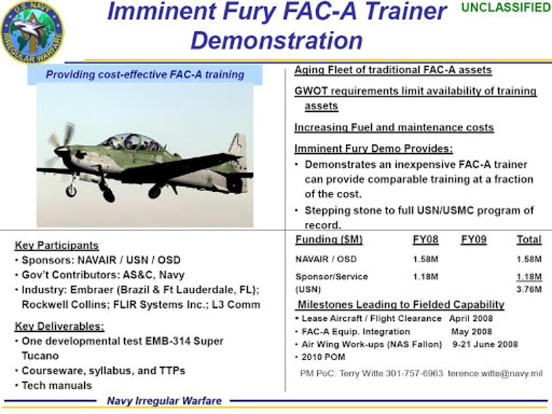First mentioned in the Corps’ 2016 master aviation plan, the idea reappeared in the 2017 version. However, the Marines have been interested in this concept since at least 2009, when the Navy coordinated a similar demonstration program nicknamed Imminent Fury involving a Super Tucano. That project subsequently transitioned to a special operations light attack experiment, ultimately resulting in the deployment of a pair of modified OV-10 Bronco aircraft to fight ISIS in Iraq in 2015. As The War Zone’s own Tyler Rogoway wrote in March 2017, the Marine Corps training program could be a stepping stone to a broader, deployable light attack capability within the service, as well as the U.S. Navy.