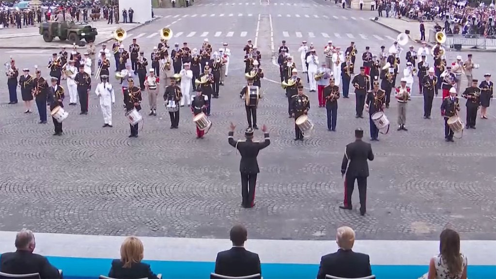 President Trump on the other hand sat expressionless with a stern look on his face. Maybe he isn’t a Daft Punk fan, or was confused why such a pop song would be played by a military band during the Bastille Day parade. Either way, it was an odd comparative movement for cameras who cut back to the two world leaders repeatedly. But forget the politicians, these guys and gals in uniform did a great job with their rendition of the mega hit.