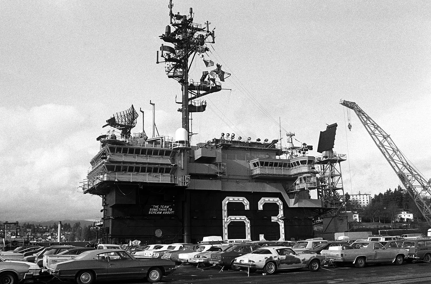 In port, the air wing would put up a wooden partition just inboard of the officer’s brow that displayed all of the squadron plaques. I would come aboard after a night on whatever town we were in, surreptitiously remove one of the plaques (a squadron, never the air wing), stick it under my shirt, walk across the hangar deck to the other sponson, throw the plaque in the drink, climb down the ladder and head to my stateroom to sleep.