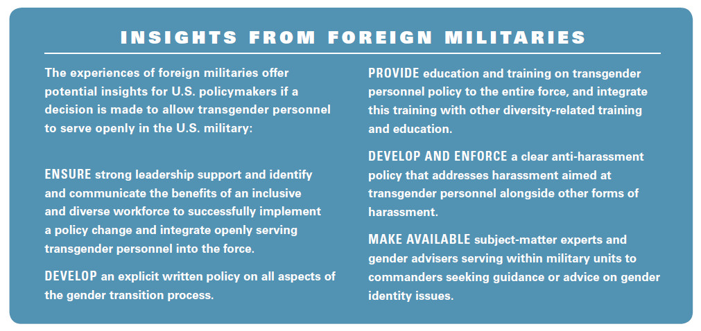 At present, there is no conclusive evidence to support or contradict the claims that transgender individuals would overly burden the U.S. military’s healthcare system, negatively impact “unit cohesion,” or otherwise limit forces’ ability to fight and win. Critics have made many of these same arguments in the past against women and homosexuals openly serving in uniform.
