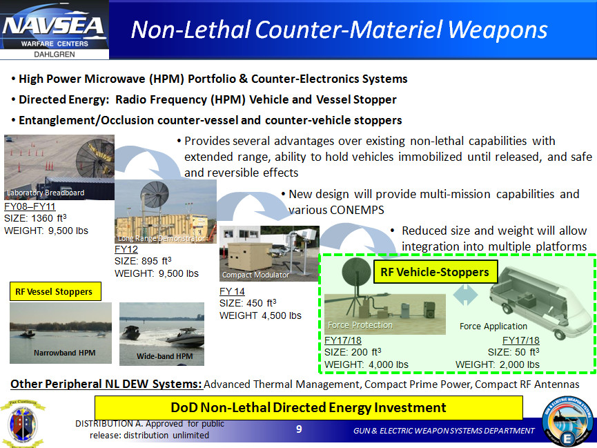 But maybe most importantly, the U.S. Navy has been hard at work on radio-frequency disruptors than can zap the engine in a car or boat and bring them to a halt. One potential scenario would be bringing car or truck bombs to a halt before they can reach their target. If that doesn’t work, the same system might be able to trigger the explosives early, away from friendly forces. Engineers were already testing a prototype “RF Vehicle Stopper” during the 2008 fiscal year, according to a Naval Surface Warfare Center – Dahlgren Division presentation the author previously obtained through the Freedom of Information Act.
