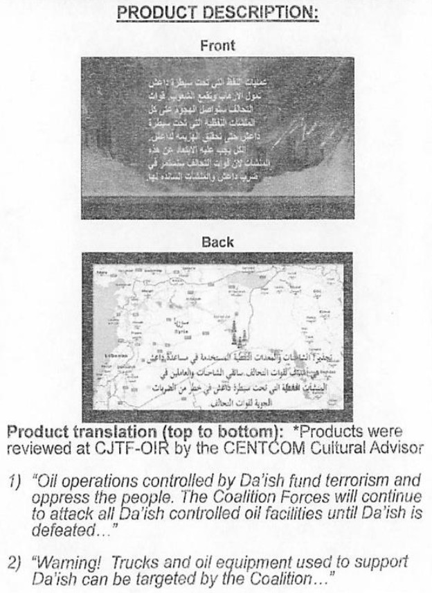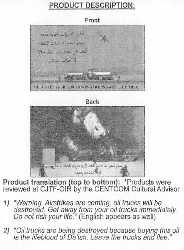 Ahead of similar strikes against hundreds more tankers and other oil infrastructure in neighboring Syria, U.S. aircraft dropped more leaflets with similar messages. “The Coalition Forces will continue to attack all Da’ish controlled oil facilities until Da’ish is defeated,” one declared.