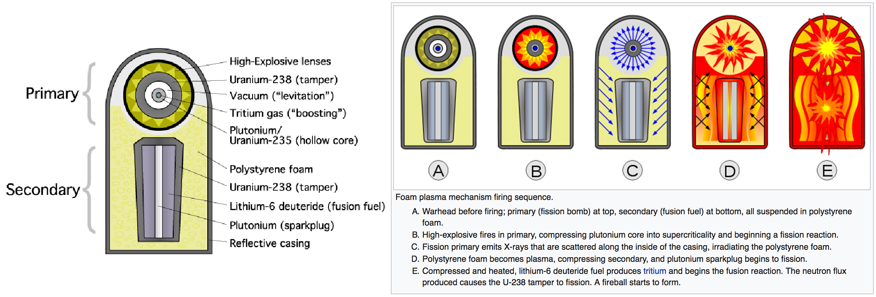 First, an igniting explosion compresses a sphere of plutonium-239, the material that will then undergo fission. Inside this pit of plutonium-239 is a chamber of hydrogen gas. The high temperatures and pressures created by the plutonium-239 fission cause the hydrogen atoms to fuse. This fusion process releases neutrons, which feed back into the plutonium-239, splitting more atoms and boosting the fission chain reaction.”