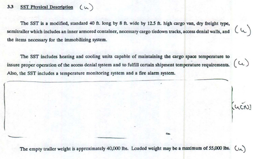 The empty SST, which looks like a standard dry freight semi-trailer on the outside, weights 40,000 pounds. The maximum loaded weight is 55,000 pounds, including nearly two pounds of explosives. Inside, the cargo itself would sit within another armored container that further impedes any attempts to steal the contents.