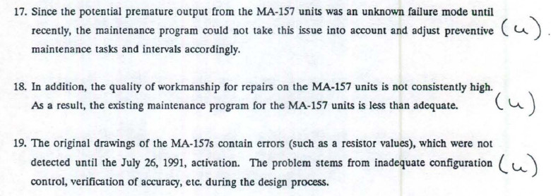 “The original drawings of the MA-157s contain errors (such as a resistor values), which were not detected until the July 26, 1991, activation,” the report continued. “The problem stems from inadequate configuration control, verification of accuracy, etc. during the design process.”