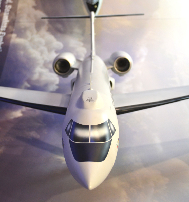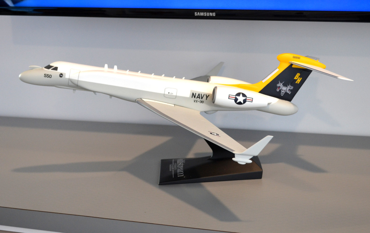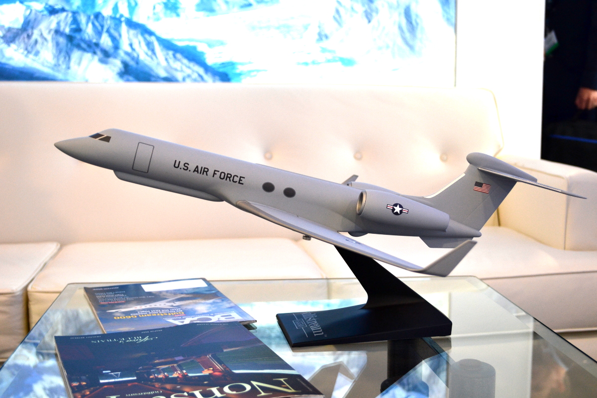 Gulfstream also had a model of another G550 the company is working on for the U.S. Navy. Commonly known as the NC-37B, to patrol and otherwise monitor testing grounds to keep out civilians and gather research data. L3 recently chose to use a similar airframe as the basis for a replacement for the Air Force’s EC-130H Compass Call jamming aircraft.