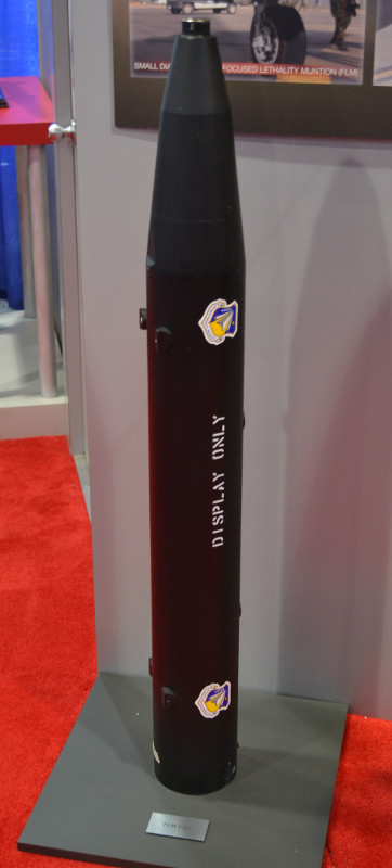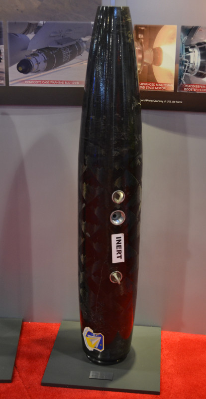 Beyond aircraft and drones, there were also weapons. Aerojet Rocketdyne had inert display versions of their Focused Lethality Munition (FLM) and BLU-129/B composite bomb casings, both of which produce little shrapnel, reducing the potential for collateral damage. The FLM is a warhead option for the 250-pound class GBU-39/B Small Diameter Bomb, while the BLU-129/B forms the core of the Very Low Collateral Damage Bomb (VLCDB) variant of the 500-pound class Joint Direct Attack Munition (JDAM), also known as the GBU-38(V)5/B.