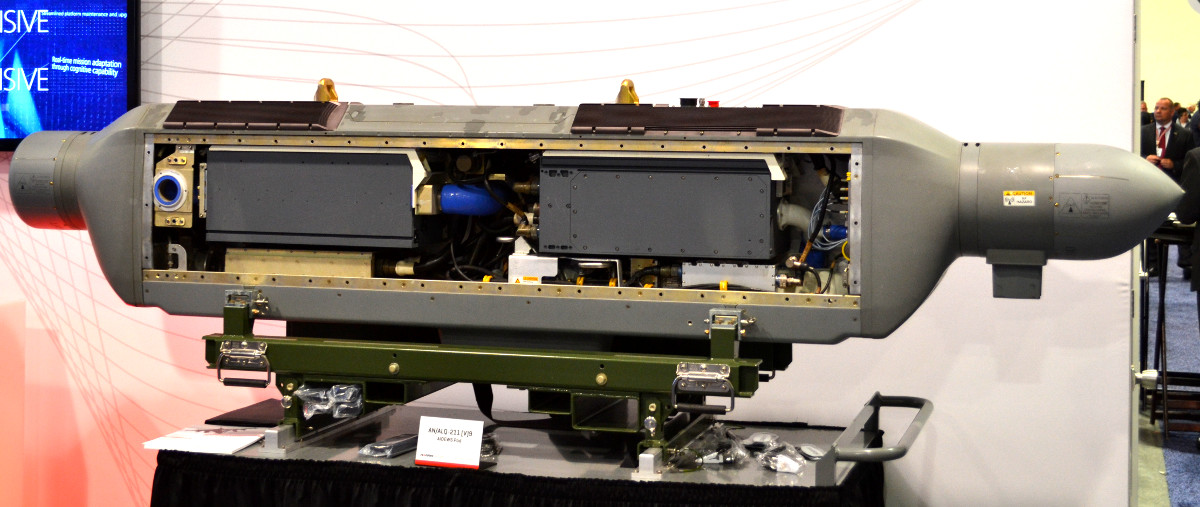 There were podded sensor and electronic warfare systems, as well. Harris had a cutaway of the podded version of its Advanced Integrated Defensive Electronic Warfare Suite (AIDEWS), the AN/ALQ-211(V)9. The company makes internal versions of the same system for F-16 Viper fighter jet and the CV-22 Osprey tilt-rotor.