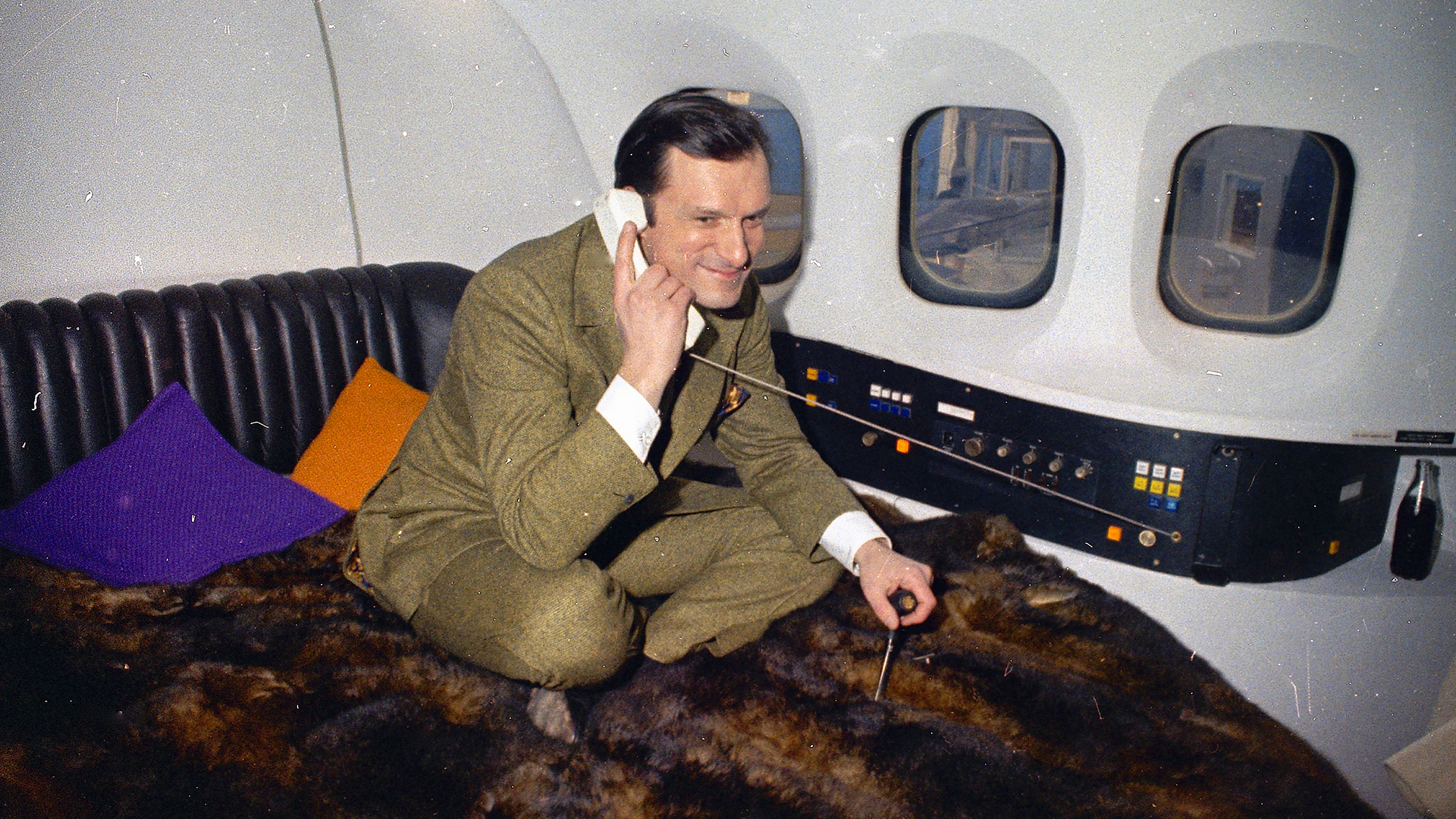 Inside it featured a theater, multiple lounges, full bathrooms with showers, and of course a big rounded water bed for the top playboy himself. Throughout his life, Hefner did much of his business atop his bed sheets, and to him the bed wasn’t just a place to sleep and to, well, party, it was also an office. The bed had silk sheets with a Tasmanian opossum beadspread and all the comfort and connectivity controls the airplane had to offer were build into a sweeping console that curved along the side of the eight foot bed, below the windows. It looked like Captain Kirk’s quarters aboard the Starship Enterprise.