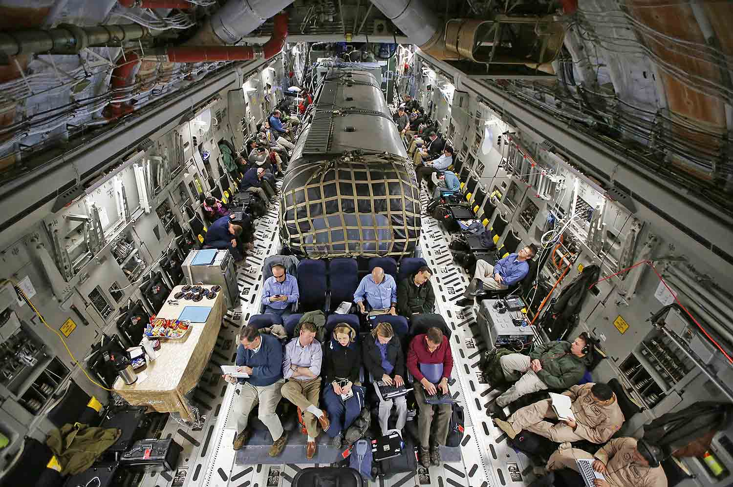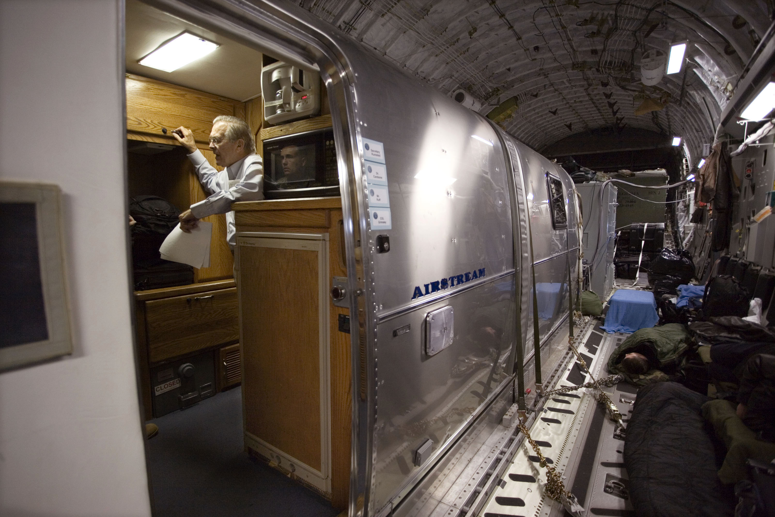 The Secretary of Defense’s usual ride, the E-4B National Airborne Operations Center (NAOC) doesn’t benefit from an elaborate infrared countermeasures suite and these aging aircraft have limited availability. But that doesn’t mean the Pentagon’s head honcho has to sit in an airliner seat bolted down in the C-17’s cargo hold the entire flight into a war zone. Instead he gets to use one of the Air Force’s two customized airstream VIP “Command and Control” (C2) pods aptly nicknamed “Silver Bullets.”