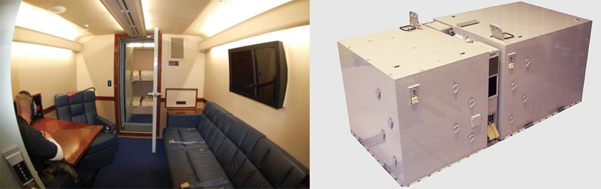 The Silver Bullets came out of a USAF Research Lab initiative dating back to around 1990. The idea was to get something modular that could provide a VVIP/distinguished guest the privacy required to discuss sensitive matters, while also being comfortable enough for them to relax or get work done while en route to a destination. Above all else they had to offer the connectivity required to provide officials with multiple forms of communications to the outside world. In addition, these “pods” of sorts had to be relatively affordable, so starting from scratch really didn’t make sense.