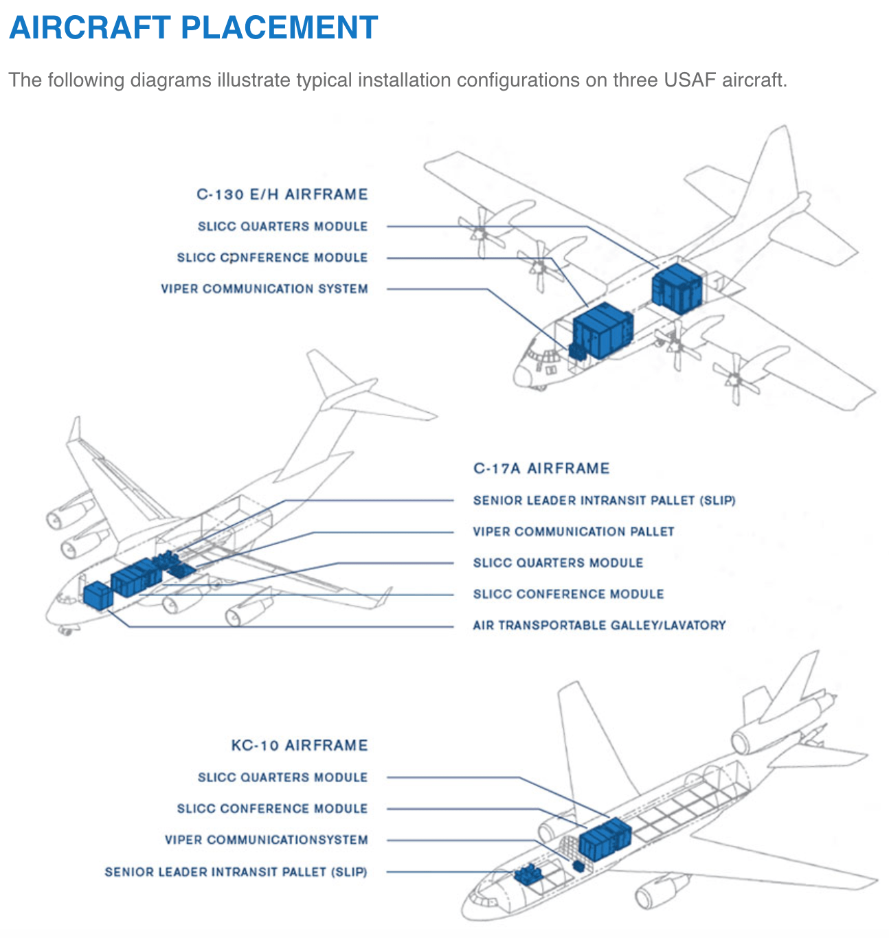 The Air Force has tried for over a decade to replace the Silver Bullets with something more lavish, certified for all phases of flight, and more technologically advanced. Two related programs from around 2008 drew disdain from government oversight group and the media. One was to produce a palleted system for “world class” first class style seating for VIPs called the Senior Leader In-transit Pallet (SLIP). The other program was to develop an enclosed executive suite called the Senior Leader In-transit Conference Capsule (SLICC).