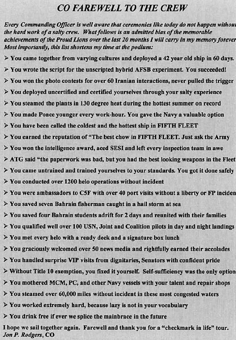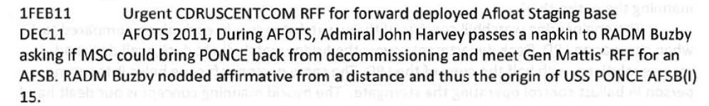 So, on the sidelines of the symposium, Harvey slipped Buzby a handwritten note on a napkin asking if it would be possible to save Ponce from retirement and use the ship to meet Mattis’ needs, according to one of three Command Operations Reports for the ship’s official internal histories, which we got through FOIA. “Buzby nodded affirmative from a distance,” the annual review noted.