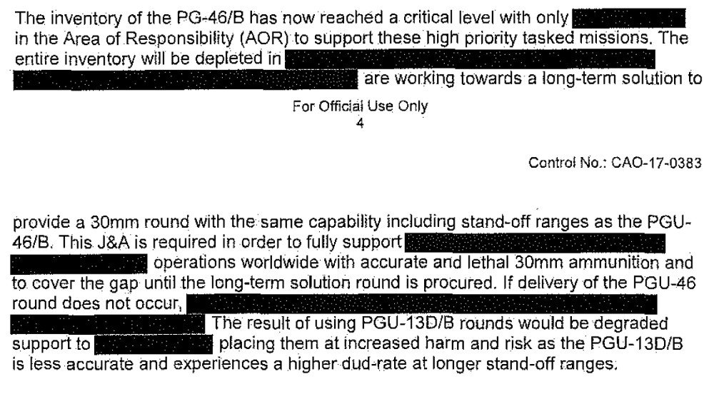 “The inventory of PG-46/B [sic] has now reached a critical level,” the contracting document explains. “The result of using PGU-13D/B rounds would be degraded support to [redacted] placing them at increased harm and risk as the PGU-13D/B is less accurate and experiences a higher dud-rate at longer stand-off ranges.”