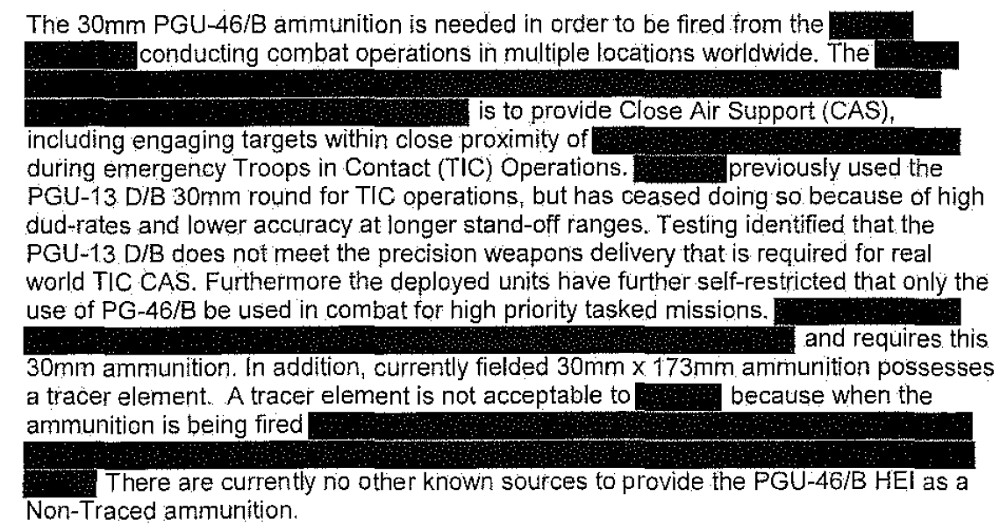 “[Redacted] previously used the PGU-13D/B 30mm round for TIC operations, but ceased doing so because of high dud-rates and lower accuracy at stand-off ranges,” the contracting document explained. “Testing identified that the PGU-13D/B does not meet the precision weapons delivery that is required for real world TIC CAS. Furthermore the deployed units have further self-restricted that only the use of PG-46/B be used in combat for high priority tasked missions.”