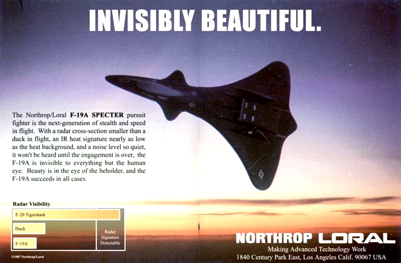 The rumor persists to this day, but there has never been any confirmed evidence that the F-19 actually exists. A pair of Loral/Northrop ads supposedly for the Specter routinely circulates on the internet, the obvious suggestion being that they requested the F-20 designation to hide the stealth jet, but nothing to prove that they’re genuine. In addition, Northrop’s failed competitor to the F-117, the XST, has become public knowledge and it looks more similar in shape to Lockheed’s stealth fighter than the purported F-19.