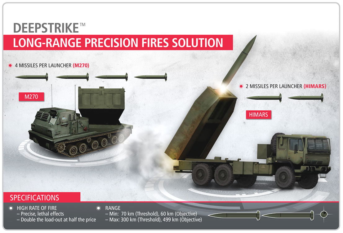 On top of that, Raytheon is working on a new long-range missile to replace the ATACMS known as DeepStrike. The company says the final product should be able to hit targets approximately 310 miles away, significantly increasing the distance at which HIMARS crews would be able to engage the enemy. Each launcher would be able to hold two DeepStrike missiles instead of just a single ATACMS, too. An extended range version of the standard 227mm rocket, that can travel nearly 60 miles is also in development.
