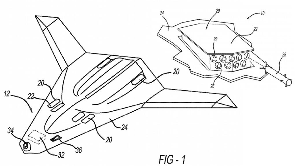 The graphic, which supposedly shows a conceptual “futuristic” combat aircraft, has six pop-out launcher pods with nine miniature defensive missiles each facing both fore and aft (labeled 20 on the graphic). The patent notes that the pods are flush with the aircraft’s skin when retracted.
