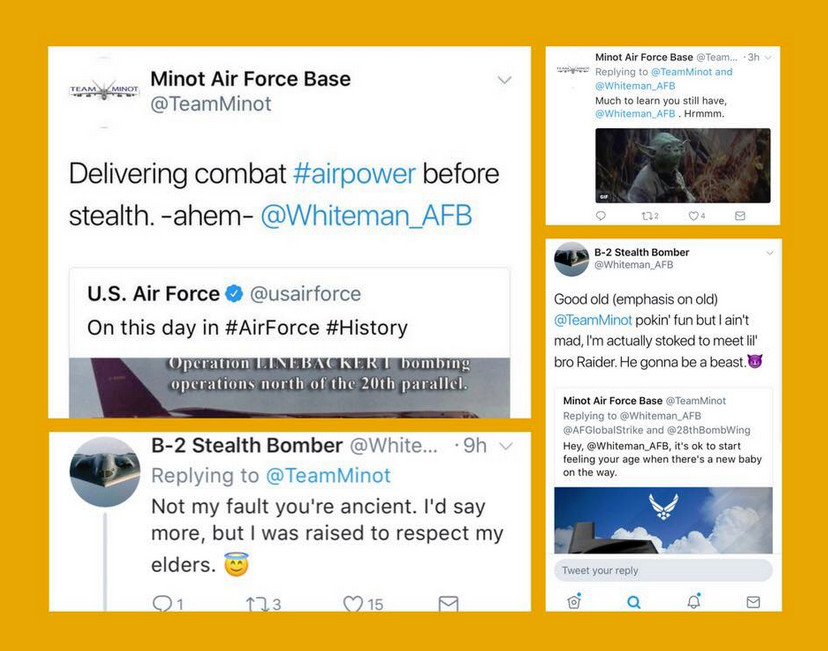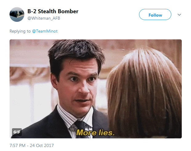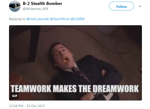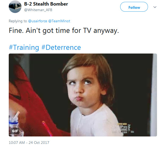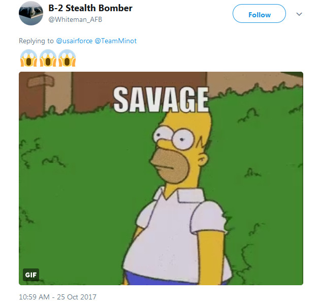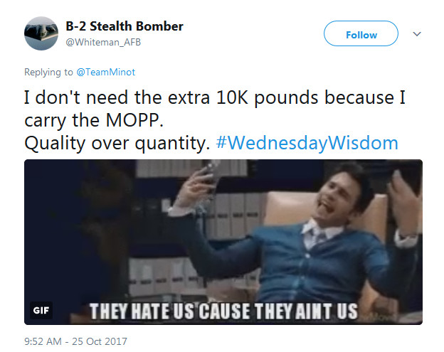 But whoever’s behind the Minot’s Twitter account didn’t stop there. On Oct. 24, 2017, the base decided to engage in a bit of sibling rivalry with the team at Whiteman Air Force Base in Missouri, home to the 509th Bomb Wing and its stealthy B-2 Spirit bombers.