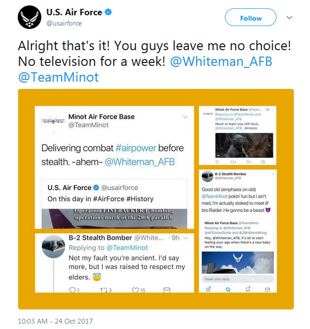 Near the end of the day on Oct. 25, 2017, whoever runs the main Air Force Twitter account had clearly decided it was time to go figuratively thermonuclear and try and end banter. “We didn’t want to do this, but if you 2 can’t get along we must,” the post began.
