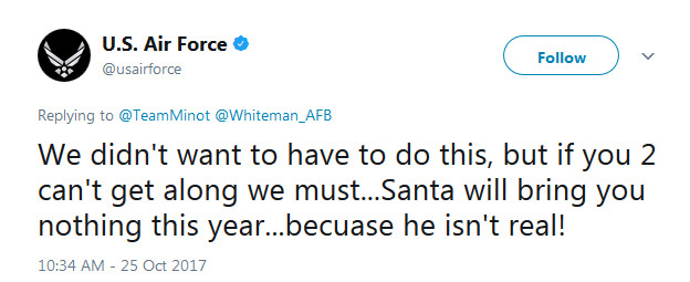 The Santa debacle seemed to end the whole episode, whether the Air Force’s Twitter account was ever really serious about wanting to curtail it or not. Minot has since deleted most of its Tweets, but Whiteman’s posts are still up. It’s why we’ve chosen to use screen shots throughout this story, in order to best preserve a record of this oddly intense debate.