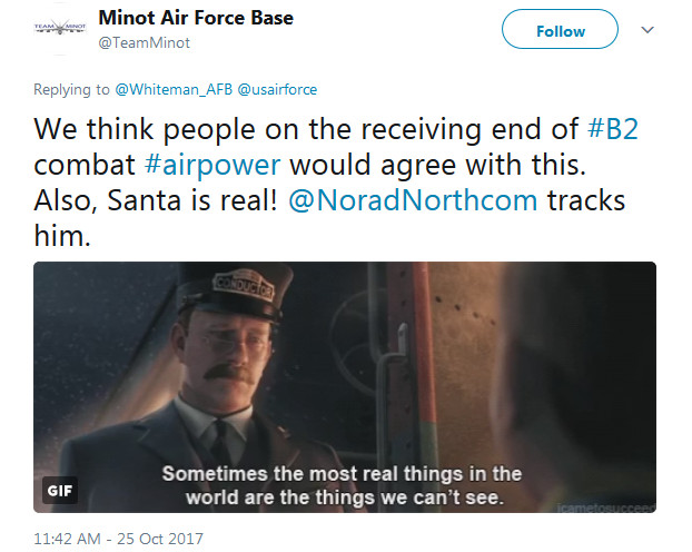 “Santa is real,” it Tweeted out. “Bluffing to get @Whiteman_AFB @TeamMinot in line.”