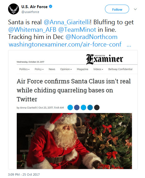 The Washington Examiner quickly ran a story saying that the air Force had “confirmed’ that Santa wasn’t real, putting the service’s Twitter account into something closer to more conventional damage control.