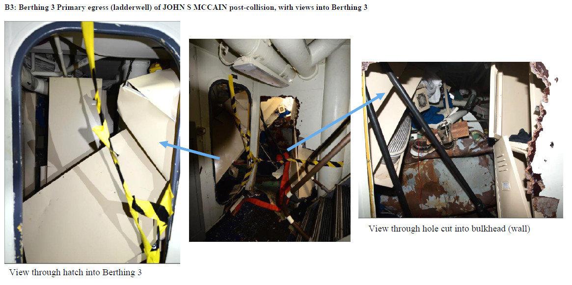 “The second Sailor was in a bottom rack in Berthing 3. His rack was lifted off the floor as a result of the collision, which likely prevented him from drowning in the rising water, and he was trapped at an angle between racks that had been pressed together. Light was visible through a hole in his rack and he could hear the water and smell the fuel beginning to fill Berthing 3.