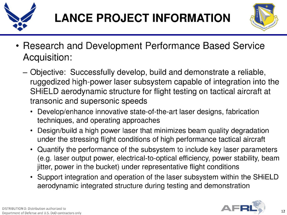 On Nov. 6, 2017, Lockheed Martin announced it had received the contract award, valued at more than $26 million, from the Air Force Research Laboratory (AFRL). The deal appears to cover only the Laser Advancements for Next-generation Compact Environments (LANCE) component of the larger Self-protect High Energy Laser Demonstrator (SHiELD) program. The project also includes development of a turreted beam control system to aim the energy weapon, SHiELD Turret Research in Aero Effects (STRAFE), and of a self-contained pod that will attach both items to the aircraft, called Laser Pod Research & Development (LPRD).
