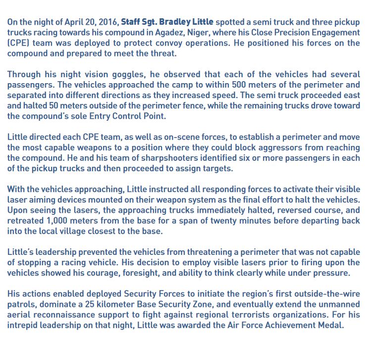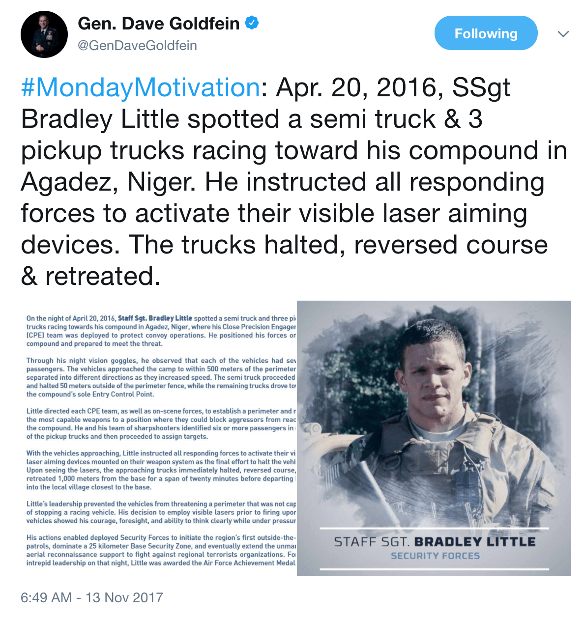 On the night of Apr. 20, 2016, Staff Sergeant Brady Little, a U.S. Air Force Security Forces airman from an unspecified unit, along with his comrades at the American base in Agadez successfully dissuaded a group of potential attackers who were approaching the site in three pickup trucks and semi-truck. U.S. Air Force Chief of Staff General David Goldfein posted an account of the incident on Twitter on Nov. 13, 2017, which the U.S. military does not appear to have acknowledged until now, ostensibly to highlight Little’s fast thinking. The service’s top officer combined the post with the hashtag “#MondayMotivation.”