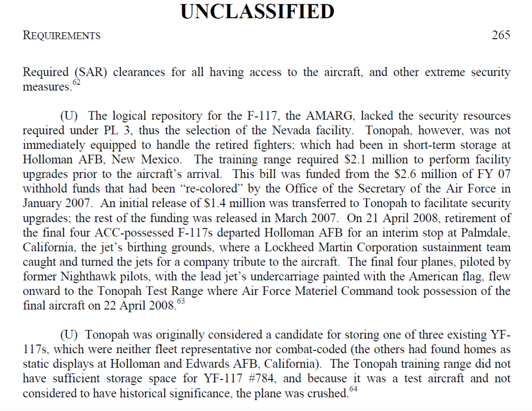 It is worth noting that Lockheed and the USAF destroyed a developmental F-117 airframe (Article #784) around the time of the type’s official retirement due to the lack of a place to store it and as a test as to how to dispose of the jets. Since then rumors have circulated that some of the “Black Jets” have been ripped apart and buried at Tonopah Test Range Airport as well.