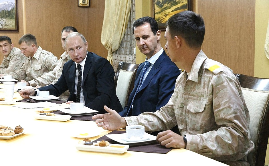 After landing, Putin reviewed and met with various Russian military personnel at the base, accompanied by Russian Defense Minister Sergei Shoigu and a noticeably giddy Syrian dictator Bashar Al Assad, among others. The trio then received a briefing in the “quaint” operations center at Hmeimim Air Base and had a meet-and-greet over coffee with what appeared to be a specially selected group of young Russian troops.