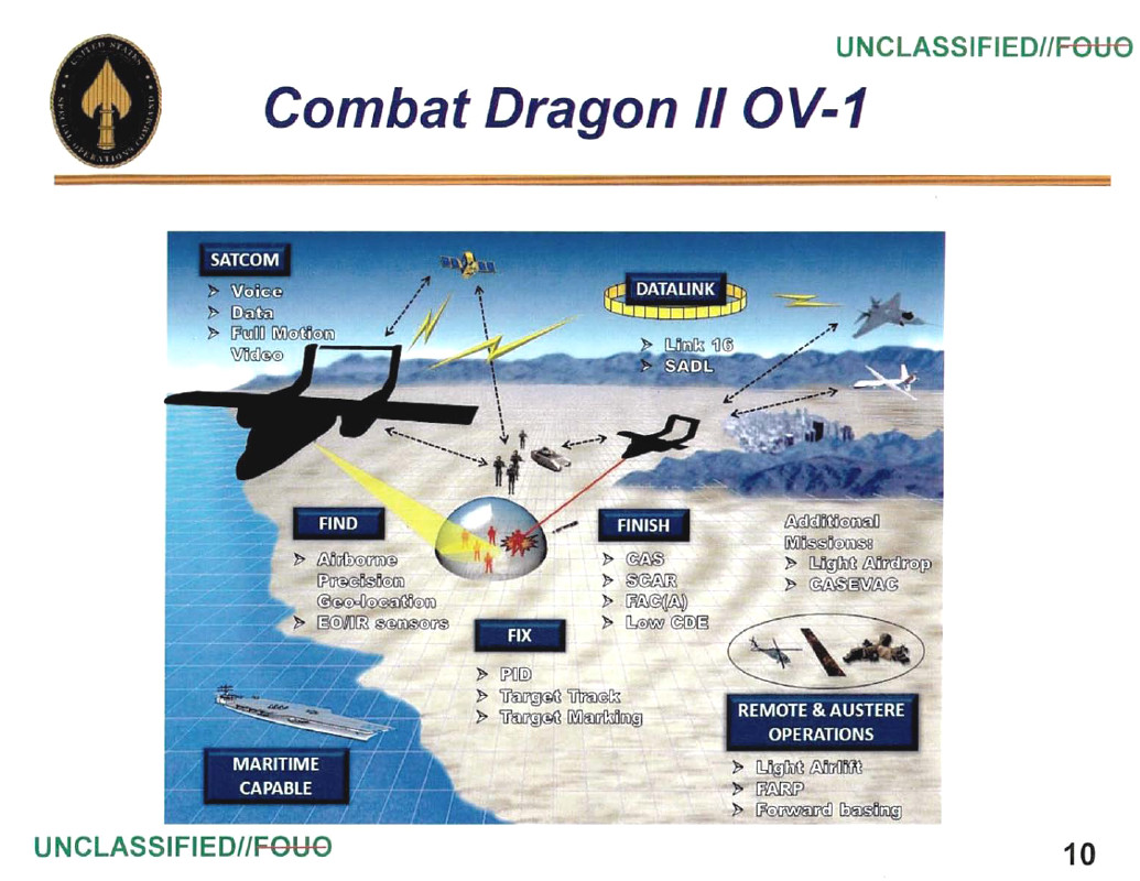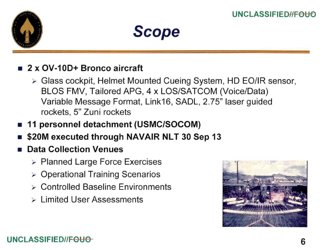 The project was always “aircraft agnostic,” according to the briefing, meaning that the chosen platform was not as important as testing the associated doctrine, tactics, and other procedures. SOCOM eventually decided to enter into a three-way partnership with the Navy and NASA to modify the pair of OV-10 aircraft into the new G+ configuration.