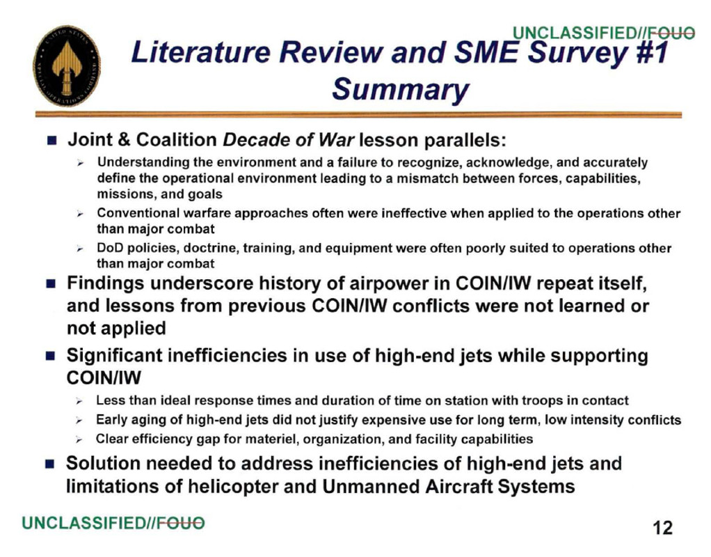 And while the initial modifications had been in progress, between October 2012 and January 2013, personnel in the Joint Chiefs of Staff’s Joint Force Development office, or J7, poured over old studies, reports, lesson learned documents, books, and other material, and interviewed dozens of subject matter experts to get their opinions on what these new aircraft should be able to do. Not surprisingly, these reviews produced many common conclusions about the utility of airpower in limited conflicts – as well as highlighting an seemingly perpetual inability to either learn or apply those lessons from previous counterinsurgency and irregular conflicts.