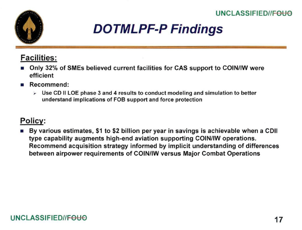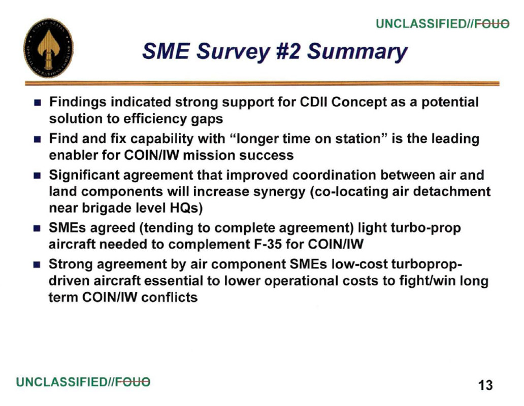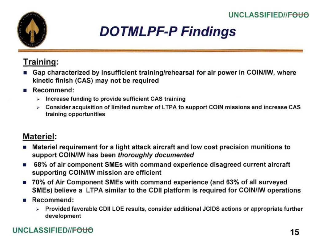 “Find and fix capability with ‘longer time on station’ is the leading enabler for COIN/IW [counterinsurgency/irregular warfare] mission success,” one bullet point in the briefing notes. “Strong agreement by air component [subject matter experts] low-cost turboprop driven aircraft are essential to lower operational costs to fight/win long term COIN/IW conflicts.”